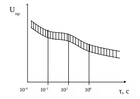 Сложный вид этой зависимости объясняется различием физических процессов при пробоях при разных длительностях воздействия напряжения.