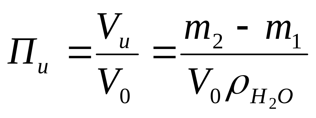 2. Открытой пористость Пи, равной отношению объемов сообщающихся между собой и поверхностью образца пор Vи, к объему образца V0: