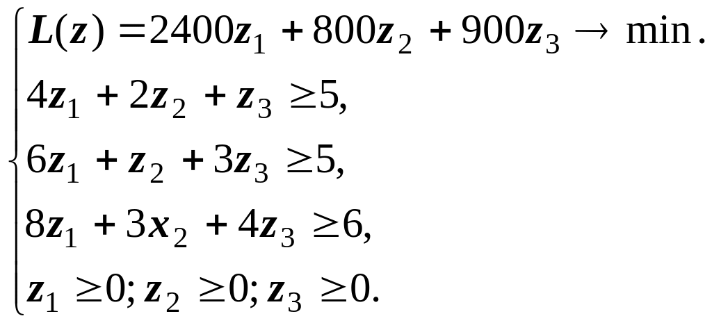 Составим двойственную к (11) задачу, как предложено выше в пункте “Элементы теории двойственности”, как задачу на минимизацию с ограничениями в форме неравенств со знаком “больше или равно” и вышеприведённой транспонированной расширенной матрицей: