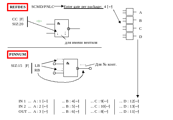 Конструкторское имя вводится командой SCMD/PNUM в активный слой REFDES. На запрос системы необходимо указать вентиль (он выделится ярким цветом) и ввести позиционное обозначение (например, DD1/A). Позиционное обозначение появится в зарезервированном для него месте. Одновременно появятся номера контактов, соответствующие указанной секции.