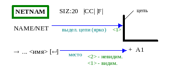Имя цепи задается командой NAME/NET и записывается в активный слой NETNAM. При вводе имени надо указать курсором именуемую цепь, ввести с клавиатуры имя и выбрать его местоположение.