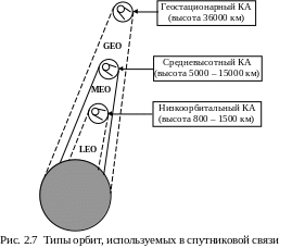 В зависимости от высоты орбиты подразделяются на геостанционарные (GEO), средневысотные (MEO) и низкоорбитальные (LEO) (рис. 2.7).