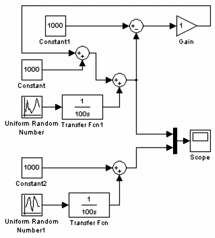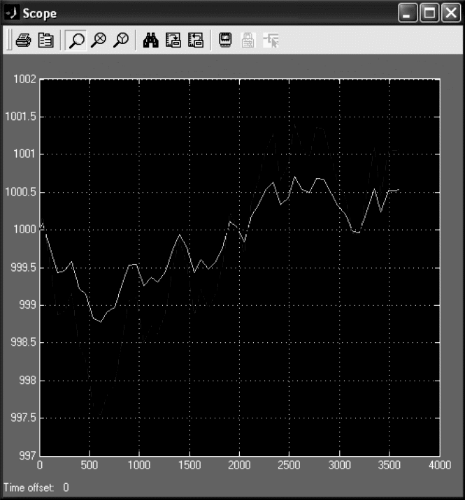 Рассмотрим пример работы автопилота. Система должна поддерживать заданную высоту полета самолета (1000 м) при воздействии факторов, приводящих к случайным колебаниям высоты в пределах 10 м. Для создания блок–схемы перетащим в новое окно редактора блоки Constant, Uniform Random Number, Transfer Fcn, Sum, Scope, Gain, Mux. Список параметров, которые необходимо изменить, приведены в табл. 7.1. Время моделирования установим равным 3600с, сохраним блок–схему под именем «pr32» и запустим на моделирование. Если все сделано правильно, результат будет аналогичным, приведенному на рис. 7.17.