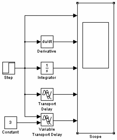 Практически все блоки, необходимые для создания линейных непрерывных систем, находятся в разделе Continuous библиотеки SIMULINK, исключение составляют блоки Sum, Product, Gain, которые находятся в библиотеке Math Operations. Для исследования их работы создадим блок-схему (рис. 7.16), изменим параметр в блоке Constant с 1 на 3, сохраним полученную модель под именем «pr31» и запустим. Результаты моделирования приведены в правой части рис. 7.16. Видно, что блок Derivative осуществляет операцию вычисления производной входного сигнала (выброс в момент перепада входного сигнала), блок Integrator -– интегрирование входного сигнала (линейно нарастающий сигнал), а блоки Transport Delay и Variable Transport Delay – задержку входного сигнала на постоянную и переменную величину времени.