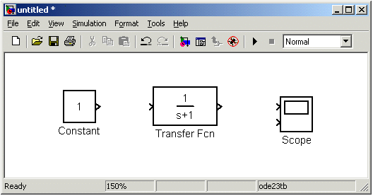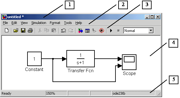 В нижней части окна модели находится строка состояния, в которой отображаются краткие комментарии к кнопкам панели инструментов, а также к пунктам меню, когда указатель мыши находится над соответствующим элементом интерфейса. Это же текстовое поле используется и для индикации состояния Simulink: Ready (Готов) или Running (Выполнение). В строке состояния отображаются также: