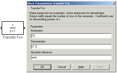 4.3. Далее, если это требуется, нужно изменить параметры блока, установленные программой “по умолчанию”. Для этого необходимо дважды щелкнуть левой клавишей “мыши”, указав курсором на изображение блока. Откроется окно редактирования параметров данного блока. При задании численных параметров следует иметь в виду, что в качестве десятичного разделителя должна использоваться точка, а не запятая. После внесения изменений нужно закрыть окно кнопкой OK. На рис.4.3 в качестве примера показаны блок, моделирующий передаточную функцию и окно редактирования параметров данного блока.