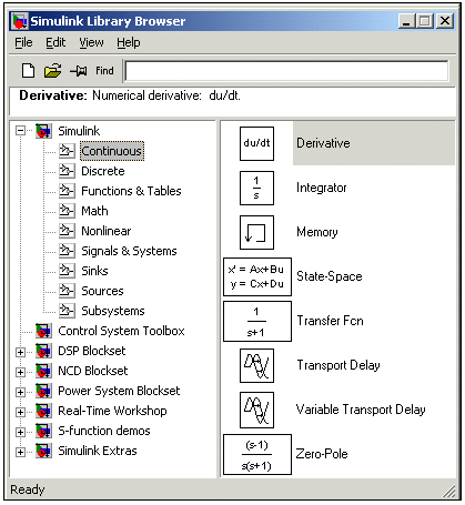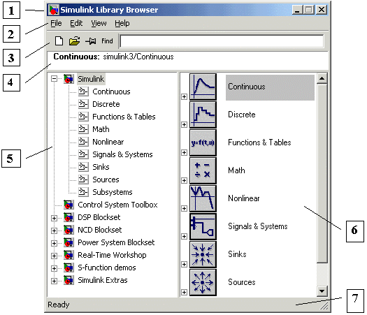 Список разделов библиотеки Simulink представлен в виде дерева, и правила работы с ним являются общими для списков такого вида: