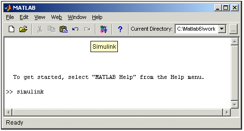 Для запуска программы необходимо предварительно запустить пакет MATLAB. Основное окно пакета MATLAB показано на Рис. 2.1. Там же показана подсказка появляющаяся в окне при наведении указателя мыши на ярлык Simulink в панели инструментов.