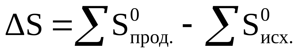Изменение энтропии в системе в результате химической реакции равно сумме стандартных энтропий продуктов реакции за вычетом суммы стандартных энтропий исходных веществ с учетом коэффициентов перед формулой этих веществ в уравнении реакции: