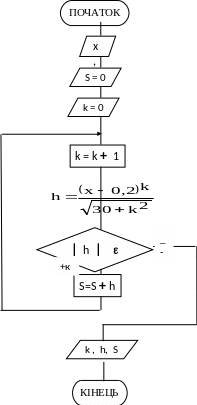 Вивести величину суми ряду S , число членів ряду k, необхідних при додаванні для досягнення заданої точності .