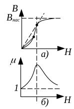 де – кут між віссю Н і проведеною з початку координат до точки на графіку функції B(Н) хорди (див. рис. 3, а). Тобто відносна магнітна проникність феромагнетика змінюється при зміні Н (див. рис. 3, б). Максимальне значення досягається у точці, де хорда перетворюється на дотичну при русі точки по кривій намагнічування.