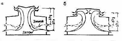 Процесс аэрации обусловлен разностью объемных весов внутреннего и наружного воздуха, а также, а также разницей давления при действии ветра.