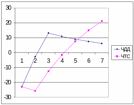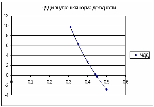 Определение приближенного значения ВНД ясно из нижеследующего фрагмента вышеприведенного графика зависимости ЧДД от нормы дисконта.