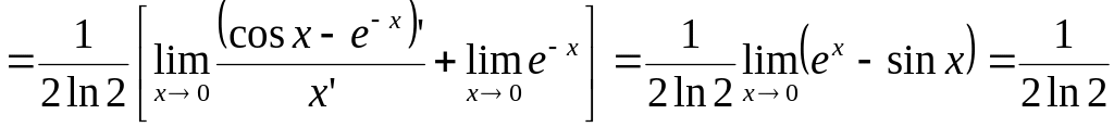 Получили предел произведения двух функций. Вычислим их отдельно. Предел второго сомножителя приводит к неопределенности . Чтобы ее раскрыть, применим правило Лопиталя повторно: