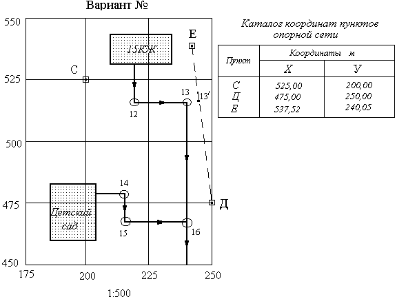 Каждому студенту для выполнения расчетно-графической работы выдается индивидуальное задание в виде бланка (рис. 1.1), на котором дан план застройки участка с нанесенными контурами проектируемых зданий и сооружений, углами поворота и пересечения трасс, центрами колодцев, пунктами плановой геодезической основы. Здесь же, на плане, дана сетка прямоугольных координат и каталог координат пунктов опорной сети.Вычертить план в масштабе 1:500 на миллиметровой бумаге