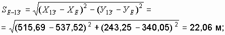 Разбивочными элементами для способа перпендикуляров будут расстояния SЕ- 13’(от ближайшего исходного пункта до основания перпендикуляра) и S13– 13' . Расстояния определяются по формуле (2.13).
