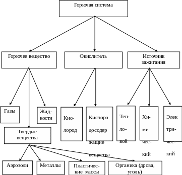 Горючее вещество и кислород являются реагирующими веществами в горючей системе, а источник воспламенения вызывает в ней реакцию горения. При установившемся горении источником воспламенения служит зона реакции.