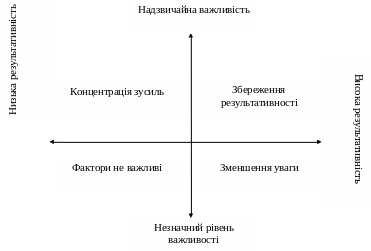 Для того, щоб правильно здійснити відбір і ранжування факторів конкурентноздатності для визначення пріоритетів удосконалення діяльності фірми, використовують матрицю “Важливість / Результативність” (рис. 1.1). Існує ряд інтерпретацій цієї матриці, але в класичному варіанті передбачається, що по вертикалі відкладають ступінь важливості факторів конкурентноздатності для клієнтів (споживачів), а по горизонталі – рівень результативності цих факторів з погляду менеджерів.
