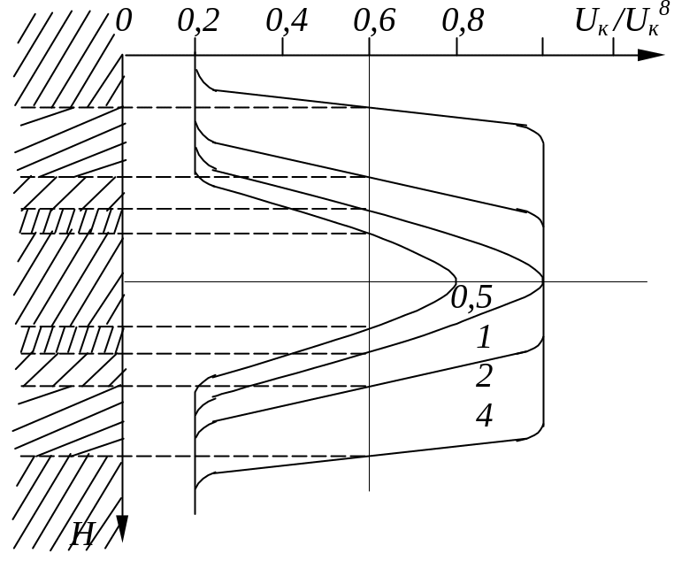 Видно, что кривые Uк симметричны относительно середины пласта. Если мощность пласта больше длины зонда (L=0,85), границы пласта отмечаются в точках на участках крутого подъема и спада кривой, расположенных примерно на половине высоты аномалии. Для пластов меньшей мощности границы смещаются к максимуму кривой.