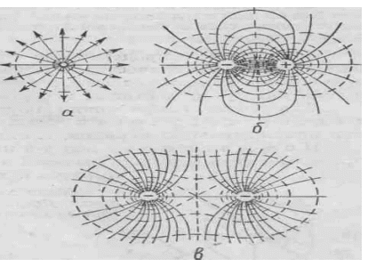 На рис. 6,б изображены силовые линии и эквипотенциальные поверхности для двух точечных разноименных зарядов, равных по численному значению, а на рис. 6, в — для двух одноименно заряженных зарядов, численно равных.
