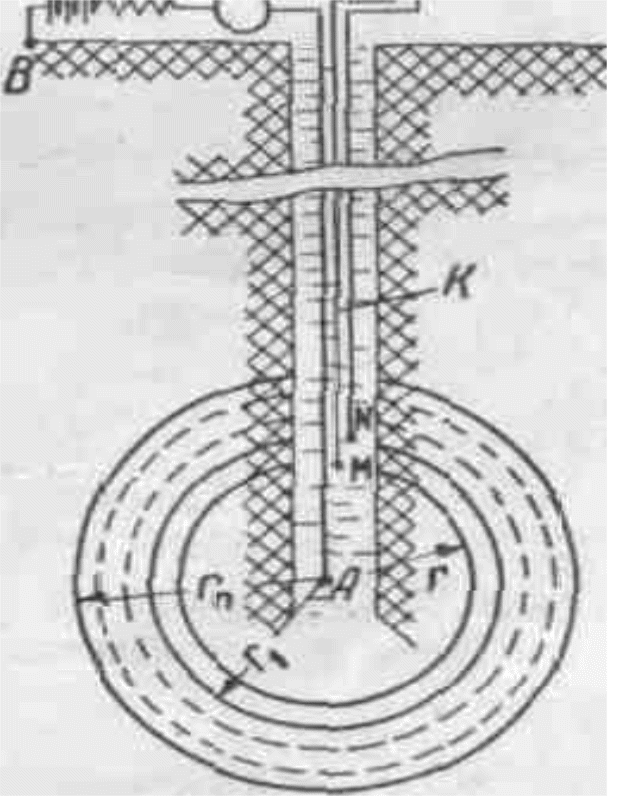 Для определения удельного сопротивления горных пород в скважине используется источник тока, создающий в окружающей среде электрическое поле.