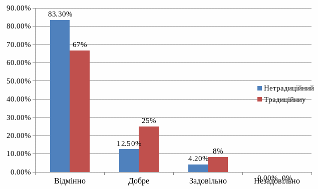 На традиційному уроці оцінку «відмінно» (12-10 балів) отримало 16 учнів – 66,7 %, «добре» (9-7 балів) отримало 6 учнів – 25 %, «задовільно» (6-4 бали) отримали 2 учнів – 8,3 %, а оцінки «незадовільно» в класі немає.