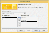 2. Выбрать запрос «Список пациентов» в выпадающем списке «Таблицы и запросы» появившегося окна «Создание отчетов» и переместить нужные поля в область «Выбранные поля» (рисунок 22), нажать «Далее».