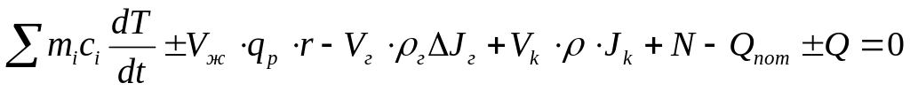 где mi – масса элемента разогреваемой системы (например, m1 – масса жидкости; m2 – масса реактора); Vж – объем жидкости, загружаемой в реактор; qр – удельная теплота реакции; r – скорость химического превращения в момент времени t; ΔJг = J2г – J1г – разность энтальпий газа на входе и на выходе в реактор; Vк – расход конденсата, возвращаемого в реактор из обратного холодильника; Jк – энтальпия конденсата; N – энергия, вносимая в реактор внешним источником (газом или мешалкой); Qпот – потери теплоты в окружающую среду; Q+ - количество теплоты, которую нужно вводить или отводить из реактора.