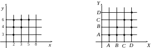 Строятся две перпендикулярные прямые. На горизонтальной прямой изображаются (точками) элементы множества , на вертикальной – элементы множества . Тогда каждая упорядоченная пара изображается точкой пересечения перпендикуляров, проведенных из точек и . Если , то изображающая эту пару точка выделяется.