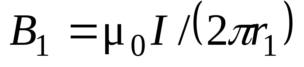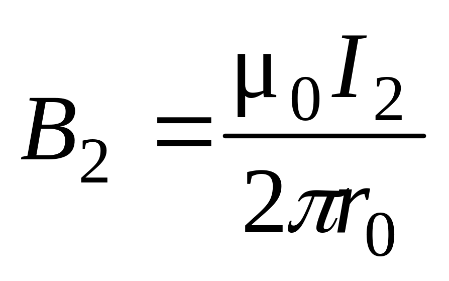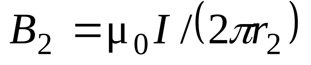 Магнитные индукции В1 и В2 выражаются соответственно через силу тока I и расстояния r1 и r2 от проводов до точки А: