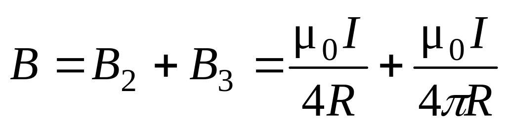 Решение. Для решения задач воспользуемся законом Био–Савара–Лапласа и принципом суперпозиции магнитных полей. Закон Био–Савара–Лапласа позволяет определить магнитную индукцию dB, создаваемую элементом тока Idl. Заметим, что вектор dB в точке А направлен за плоскость чертежа. Принцип суперпозиции позволяет для определения В воспользоваться геометрическим суммированием (интегрированием):