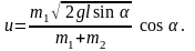 Ящик масою m1 = 20 кг зісковзується по ідеально гладкому лотку довжиною l = 2 м на нерухомий візок з піском і застряє в ньому. Візок з піском масою m2 = 80 кг може вільно (без тертя) переміщуватись по рейках в горизонтальному напрямку. Визначити швидкість и візка з ящиком, якщо лоток нахилений під кутом = 300 до рейок.