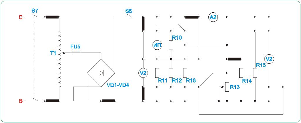 7.3.1.1. Соберите схему согласно рис. 7.2.а сначала с включением вольтметра V2 до амперметра А2. Включите стенд тумблером «СЕТЬ», затем тумблер включения питания ЛАТРа Т1 (S7) и наконец тумблер питания цепей постоянного тока (S6).