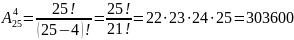 Приклад . У кружку юних математиків, що складається з 25 чоловік, необхідно обрати голову кружка, його заступника, редактора стінної газети і секретаря. Скількома способами можна утворити керівну четвірку, якщо один учень може займати тільки одну посаду?