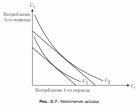 Рост дохода сдвигает бюджетную линию вверх -> более высокий уровень потребления в обоих периодах.