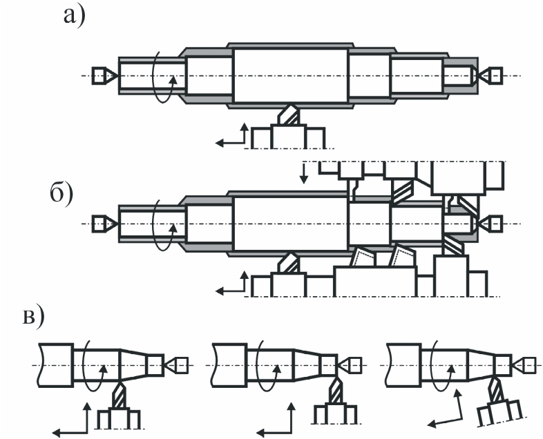 На рисунку 1.4, б наведений приклад обробки вала на багаторізцевому верстаті одночасно вісьмома і шістьма різцями за чотири установки при двох чорнових і двох чистових операціях (у двох установках при обробці лівої частини вала беруть участь три різці на поздовжньому і три різці на поперечному супортах).