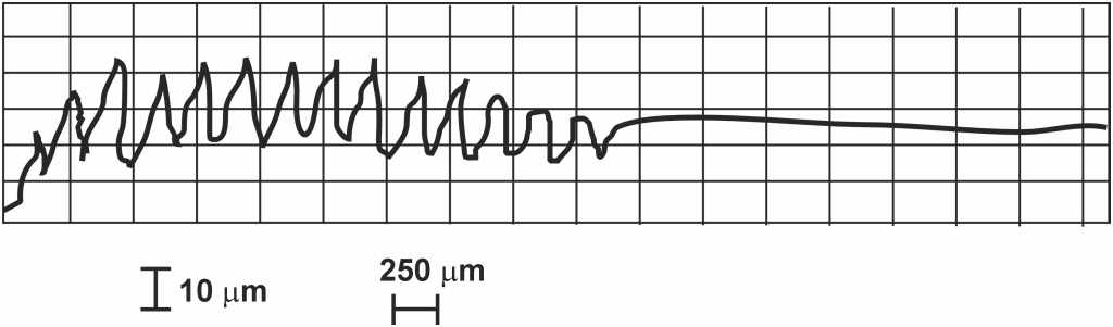 Типові профілограми поверхні металів після БУФО приведені на рисунку 3.14 . Перепади Ra з Ra вих = 5,45 мкм до RaБУФО = 0,1 мкм отримані за один прохід випромінювача ультразвуку. Зміна напруженого стану в металі характеризується приведеними в таблиці 3.1.