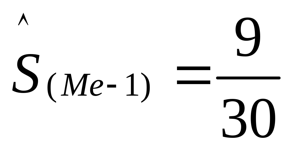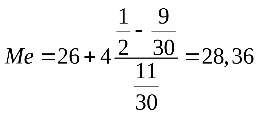 Медианный интервал определяется по накопленным частотам 26-30. Медиана определяется по формуле: