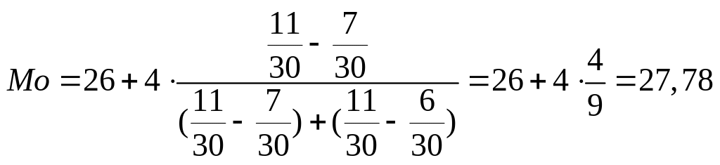 Находим модальный интервал 26-30. Ему соответствует наибольшее число студентов - 11.