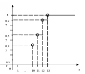 Пример 15.2. По десяти наблюдениям над случайной величиной получена выборка: 11; 12; 10; 10; 12; 10; 13; 11; 10; 11. Построить ряд распределения относительных частот и эмпирическую функцию распределения.