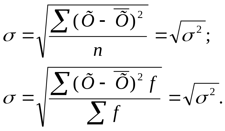 Середнє квадратичне відхилення (σ) — показує середній розмір відхилень значень ознаки від середнього рівня. Залежно від вихідних даних використовують середнє квадратичне відхилення просте і зважене (перший та другий вираз, відповідно):