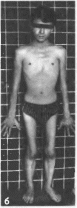 6, А та же больная в возрасте 18 лет. Грубые черты лица, гнпертелоризм, плоская переносица, грубые скелетные деформации, контрактуры суставов.