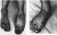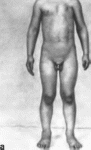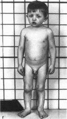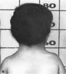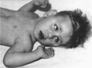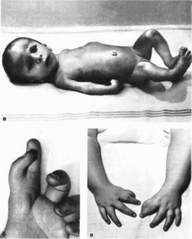- •6, А та же больная в возрасте 18 лет. Грубые черты лица, гнпертелоризм, плоская переносица, грубые скелетные деформации, контрактуры суставов.