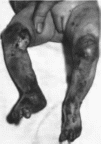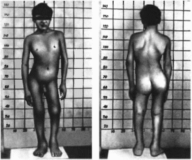 - •6, А та же больная в возрасте 18 лет. Грубые черты лица, гнпертелоризм, плоская переносица, грубые скелетные деформации, контрактуры суставов.