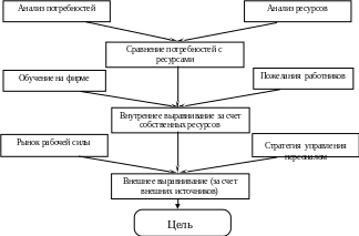 Под ресурсами подразумеваются работники фирмы с достигнутыми уровнями компетенции, желаниями, мотивациями, устремлениями. Результатом сравнения потребностей и ресурсов организации могут оказаться перестановки, передвижения, набор, обучение и т.д.