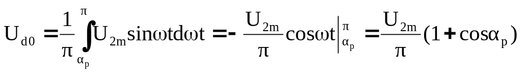 Среднее значение выпрямленного напряжения Ud (пропорционально заштрихованной площади на временной диаграмме ud) выразим через амплитудное значение переменного напряжения U2m во вторичной обмотке трансформатора с учетом изменяющегося αр:
