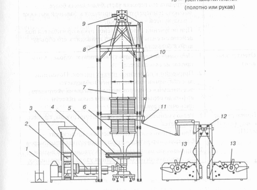1 – пневмозагрузчик; 2 – бункер; 3 – экструдер; 4 – формующая головка с адаптером; 5 – кольцовоздушного охлаждения; 6 – кольцевой бандаж; 7 – рукав; 8 – складывающиеся щеки; 9 – тянущее устройство; 10 – полотнопленки; 11 – промежуточные валы; 12 – режущее устройство; 13 – узел намотки пленок