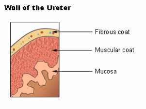 The wall of the ureter consists of three layers. The outer layer, the fibrous coat, is a supporting layer of fibrous connective tissue. The middle layer, the muscular coat, consists of inner circular and outer longitudinal smooth muscle. The main function of this layer is peristalsis to propel the urine. The inner layer, the mucosa, is transitional epithelium that is continuous with the lining of the renal pelvis and the urinary bladder. This layer secretes mucus which coats and protects the surface of the cells.