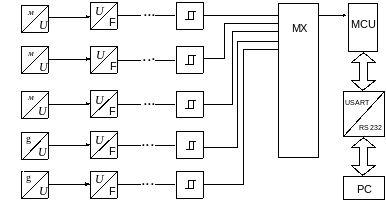 Принцип роботи наступний: по п’яти каналам проводяться вимірювання п’яти різних параметрів складного сигналу. На виходах цих каналів після вимірювання утворюється аналогові величини, які потім перетворюються з напруги в частоту і потрапляють на тригер Шмітта. Тригер Шмітта дозволяє реалізувати необхідний гістерезіс, який визначається номіналами резисторів, і також має високу завадостійкість і вхідний опір. Після цього отриманий код потрапляє на мультиплексор. Інформація з мультиплексора знімається мікропроцесором і за допомогою інтерфейсу обміну даних передається на ПК.