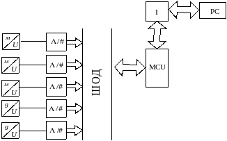 Принцип дії третьої структурної схеми зводиться до того, що існують п’ять каналів за допомогою яких проводяться вимірювання п’яти різних параметрів складного сигналу. Після цього відбувається перетворення аналогового вхідного параметру у цифровий вихідний код, все це робиться за допомогою відповідних АЦП. Вихідні цифрові коди АЦП потрапляють на шину обміну даних, звідки вони зчитується, коли потрібно, мікроконтролером. Після цього код потрапляє на персональний комп’ютер через інтерфейс обміну даними.